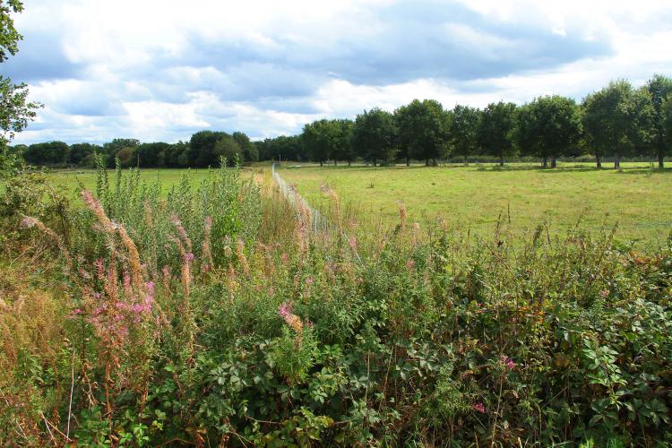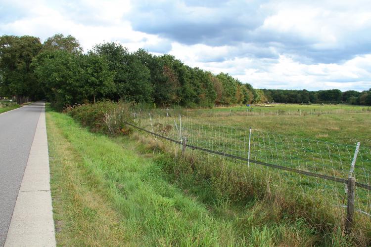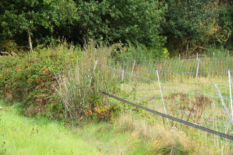 Zo ziet het genoemde raster eruit op 4 september 2025, de dag waarop het moordcontract werd gepubliceerd, waar wolf GW4003m en ieder redelijk fit mens zonder moeite overheen springt. Dit is in de verste verte niet wolfwerend; kijk bijvoorbeeld naar de begroeiing, de potentiële opstapjes en hoe het hek op punten overhelt.