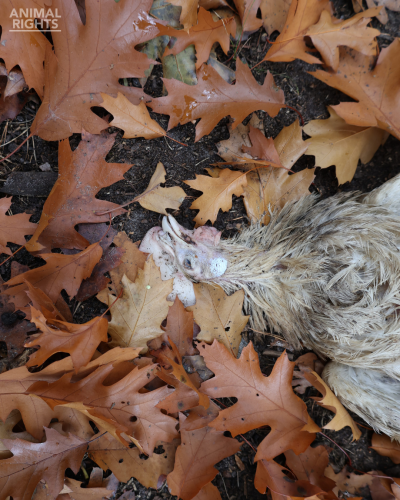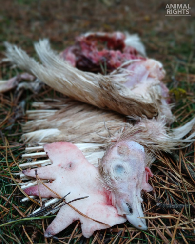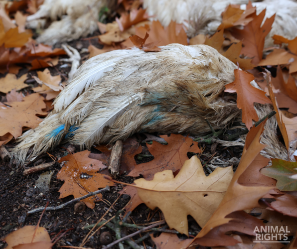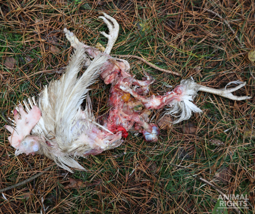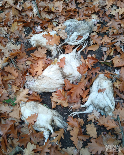 Op de foto’s die Animal Rights toegestuurd kreeg, is onder meer te zien hoe aangevreten karkassen in het natuurgebied liggen en hoe ook levende hennen in groepjes rondlopen. We zien ook een groepje dode hennen bij elkaar liggen.